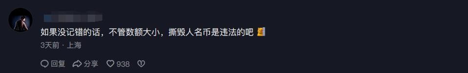 事情曝光之后,有网友表示,不管人民币的面值大小如何,只要动手撕毁了人民币,那就一定是违法行为。所以这件事,跟谁付这5毛钱没有什么关系。