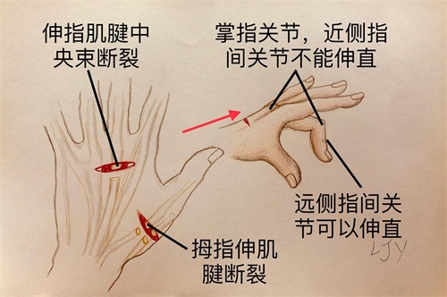 4、伸指肌腱中央束损伤:发生于近节背侧,造成近侧指间关节伸直不能。需要行肌腱吻合手术。