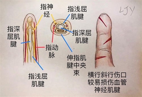 位于屈肌腱两侧,肌腱断裂时容易同时伤及。指动脉供应手指所需血液,指神经负责手指的感觉。