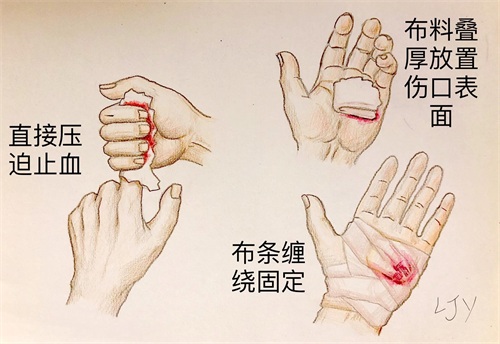 手部外伤后出血量往往与伤口大小不成正比,但我们不必过于惊慌。因为手部动脉已经非常细小,一般通过直接按压,或局部加压包扎即可控制。选取干燥的棉布(比如干净棉袜子)叠厚压在伤口表面,用另一只手用力捏住。在有人协助的情况下可以用布条反复缠绕固定以代替手捏。有弹性的布条效果更好(比如丝袜)。戴手套的情况下无需强行脱下,可直接包扎于手套外面,但最好能剪除伤处远端的手套部分,这样可以方便观察指端的血液供应情况。