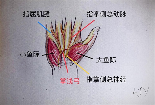 手腕处动脉进入手掌后会横向折弯形成汇合,称为掌浅弓。掌浅弓再发出指掌侧总动脉,并在掌指关节水平分叉进入手指。