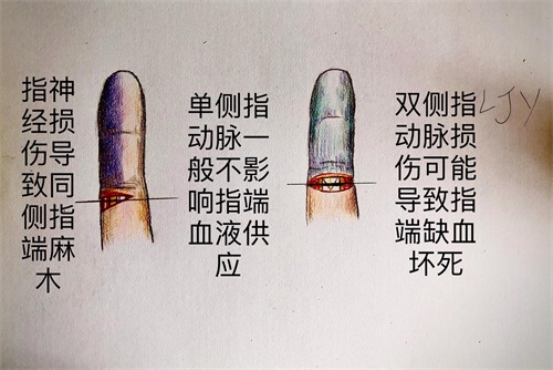 指神经也是两根,与指动脉伴行,常与动脉同时损伤。指神经损伤不会造成手指坏死,但可造成指端麻木。可以行神经吻合手术,手术后有一定几率恢复感觉,且可预防神经断端神经瘤的形成。