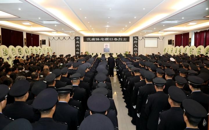 追悼会现场,颜曰春烈士安详地静卧于花丛中,鲜红的党旗覆于胸前。大厅正中央悬挂着颜曰春烈士的生前照片,“忠肝义胆铸警魂,赤血丹心映河山”的挽联歌颂着颜曰春烈士不忘初心、忠诚履职的一生。