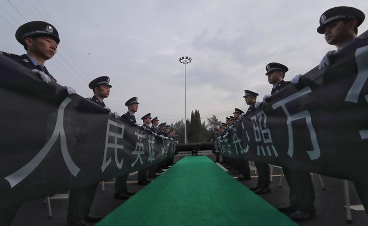 天地呜咽,全城垂泪。11时许,颜曰春烈士的骨灰在车队的护卫下缓缓从殡仪馆驶往革命烈士陵园。一路上,民警庄严敬礼,群众驻足目送,有感烈士事迹潸然泪下的,也有心中默祈烈士走好的,每个人都在用自己的方式为这位烈士送行。在烈士陵园,玉环市公安局刑侦大队民警护送颜曰春烈士骨灰入葬,惜别曾经风雨同舟的战友。