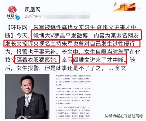 这一年,一个叫“弦子”的女生在自己的微博上发出一篇长文,直接指控央视名主持人朱军对她实施了性骚扰。