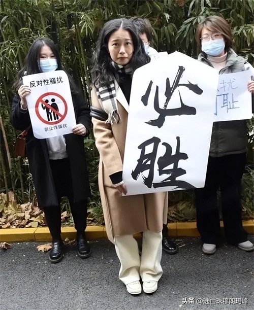 在二审前,她甚至还带人在法院门口举牌示威,高调表现自己的“受害者”形象。