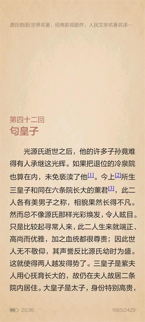 但是小说内容其实还没有结束,在手机页面上显示目前只在1665页,后面还有源氏子孙的故事情节,但人物越来越多,职位变动极快(《源氏物语》中的人物以职务称,源氏其实指的是日本皇族降为臣籍的时候所赐予的姓氏之一,并非人名,所以有些人喜欢在前面加个“光”,即光源氏,但我们默认这个源氏就是主人公,以此类推,皇帝都换了好几个了,老人都已死去,宫廷职位更是变得快,所以同种称谓的人可能也换了几遍了,若不是从头看起,你就根本不知道谁是谁了),我自己都看的云里雾里,就不能再介绍了。以后若能理清,再写几篇吧。等我把它看完,写篇总结,就要拜读《枕草子》了,书我都买好了。