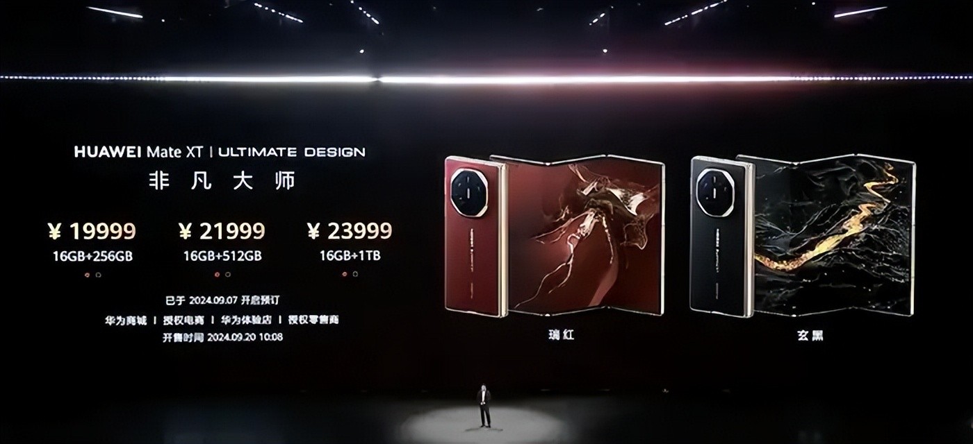 时间方面,我们关注到北京时间9月10日下午14点30分,华为正式在见非凡品牌盛典上宣布,全球首款三折叠屏手机华为Mate XT非凡大师终于来了。