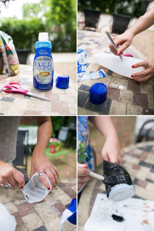1、准备一个塑料瓶,扯掉外面的塑料,把塑料瓶剪成如图所示形状,清理任何边缘,然后刷上油漆。