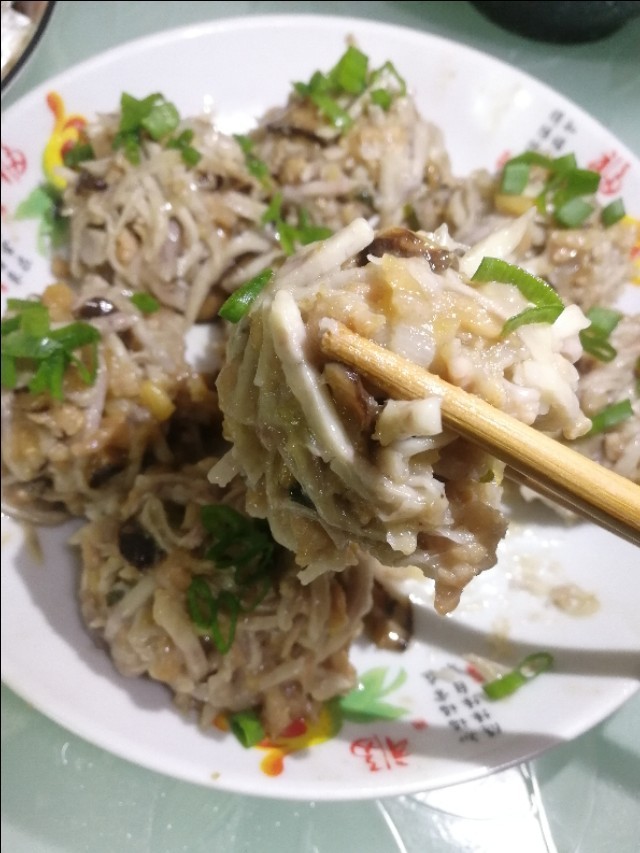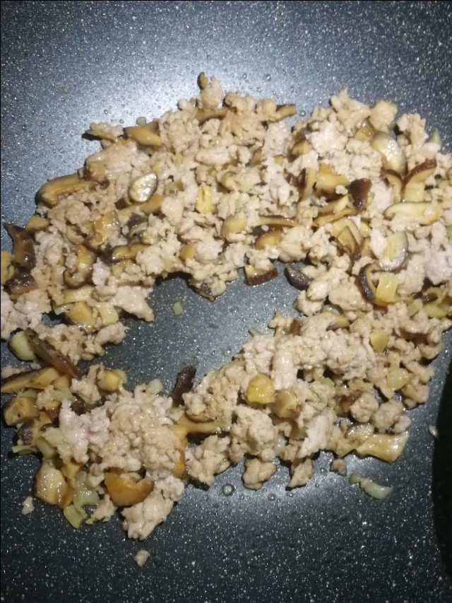 热锅下油,把猪肉,香菇,瑶柱一起翻炒一下,调入一勺酱油,捞出晾凉