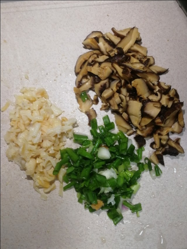 香菇用温水浸泡4-5小时泡发后,切小条或者剁碎,瑶柱用姜泡半小然后捏碎,葱苗切成葱花备用