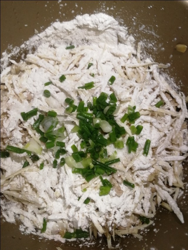 取三分之一的香芋丝,调入适量的猪肉沫材料,然后倒入适量的番薯粉,葱花和盐,然后搅拌均匀,