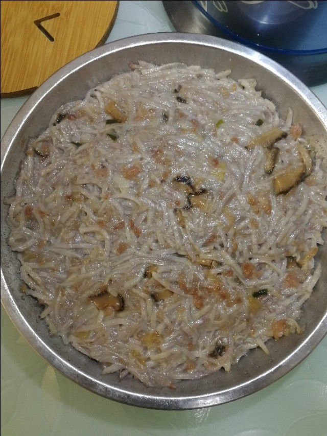 把所有材料都混合均匀,这里下的番薯粉比较多,因为要蒸后用来煎,这样会比较好成型不易散。准备一个盘子,刷上一层油,把香芋丝放入压实,锅内煮水,水开上汽,放入大火蒸25分钟