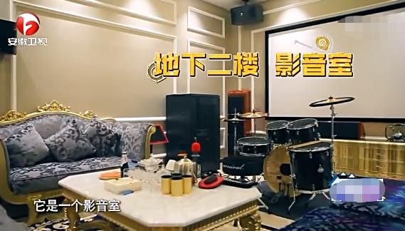 地下二楼还有影音室,有话筒,有音响,还有架子鼓,自己一个人在家没事还能K歌。