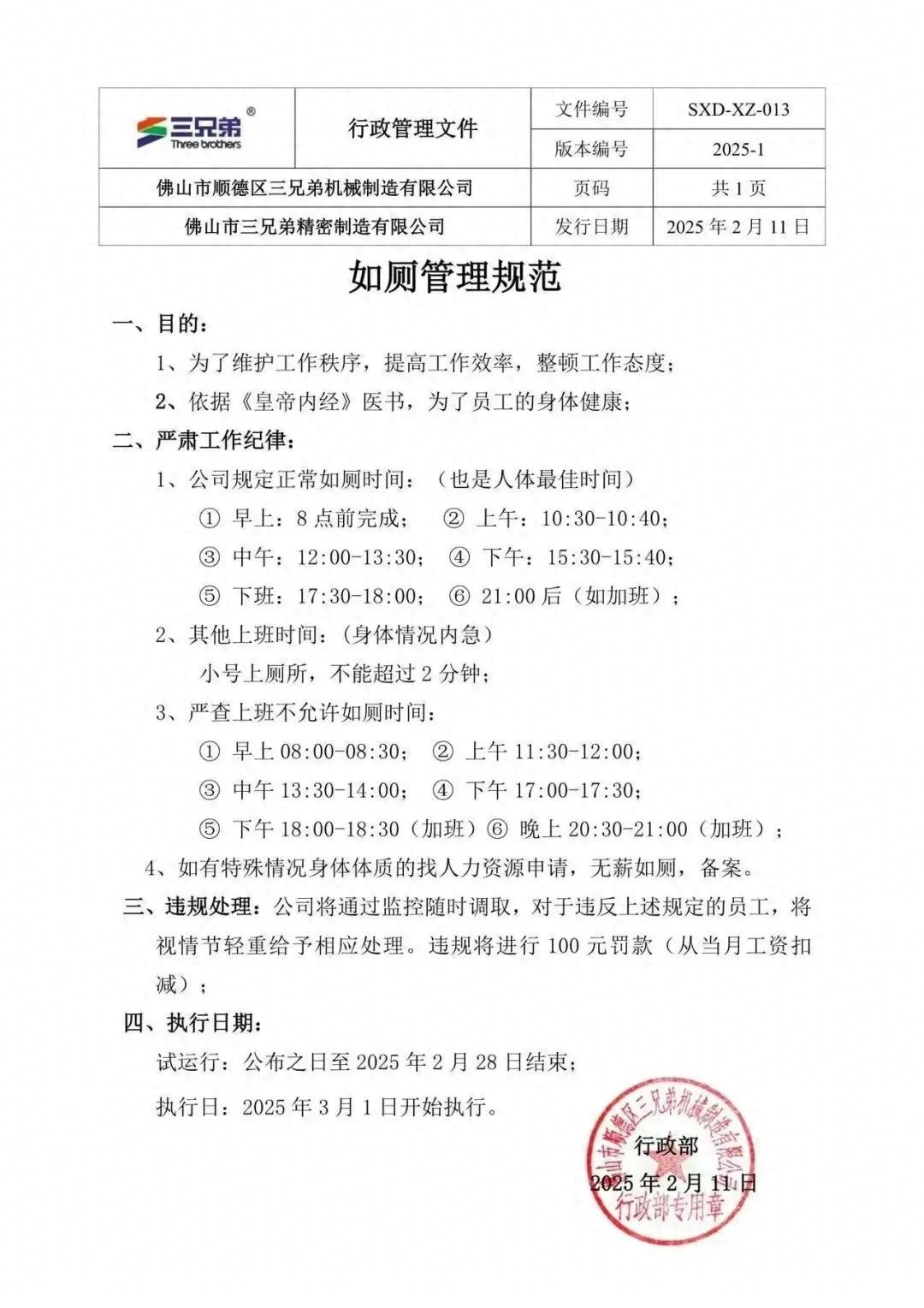 近日,一份名为《如厕管理规范》的文件在网上流传,文件上标明的发布者为佛山市顺德区三兄弟机械制造有限公司,发布时间为2月11日。