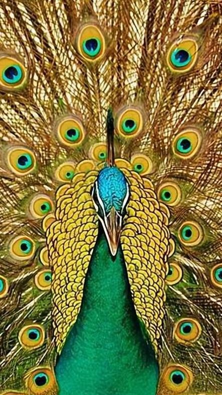 13.多么漂亮的孔雀。你见过这种身体长着绿色毛,但是开屏却是金黄色的孔雀吗?
