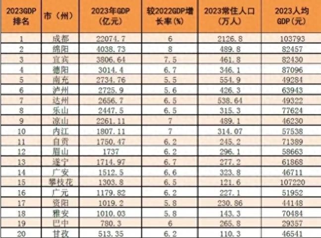 四川各市2023人均GDP排名,成都仅仅排名第二!攀枝花超成都