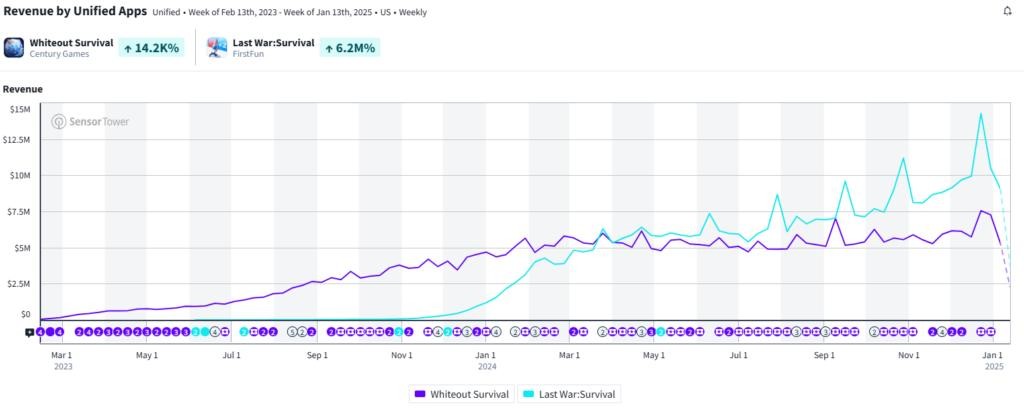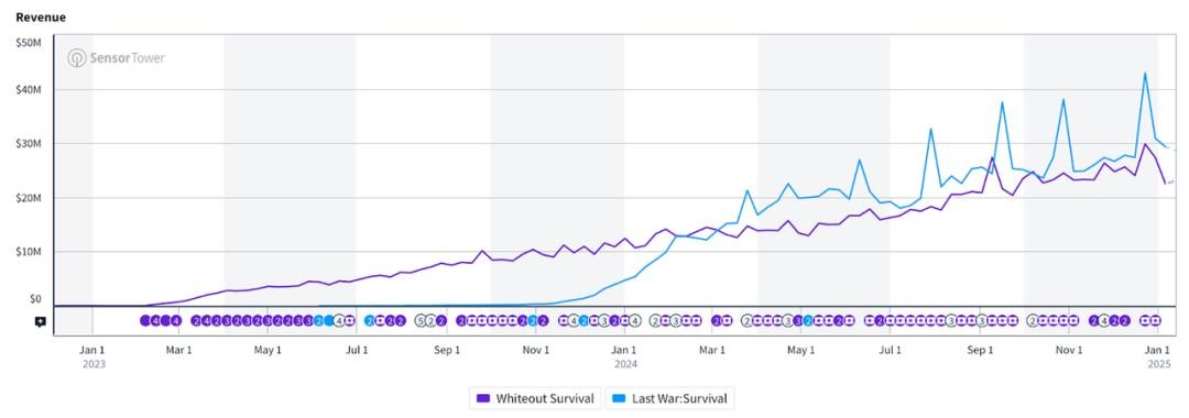 (《无尽冬日》与《Last War》的历史收入趋势对比)