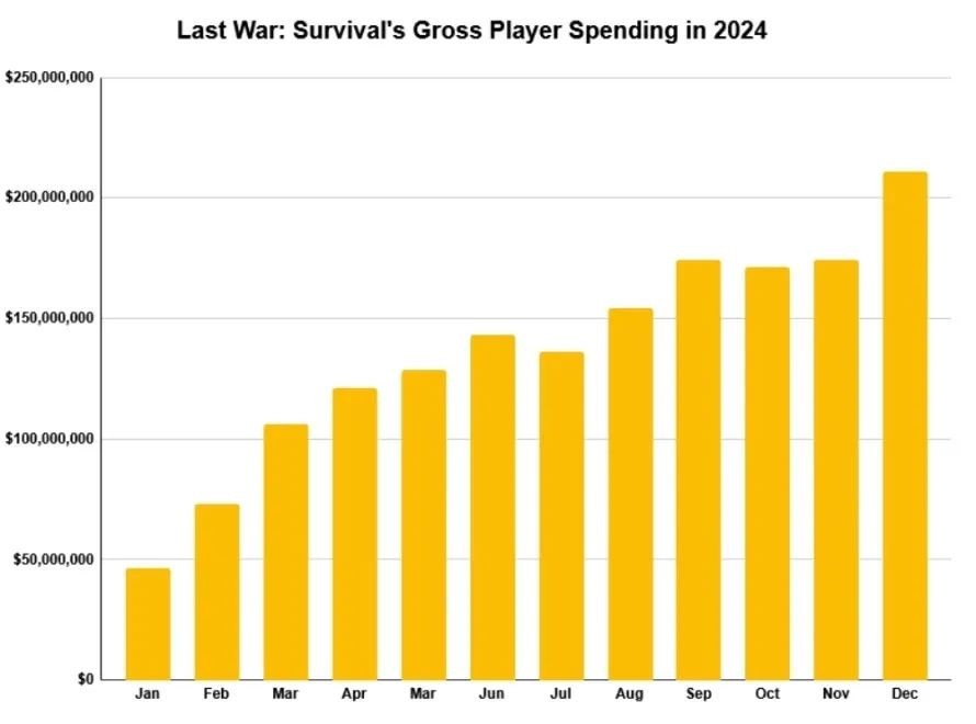 在2024年初,《Last War》开始迅速崛起。同年9月,游戏的累计收入突破10亿美元——在当时,这是它有史以来最赚钱的一个月,月收入达到了1.75亿美元,但到了12月,这个记录便被刷新为2.11亿美元。