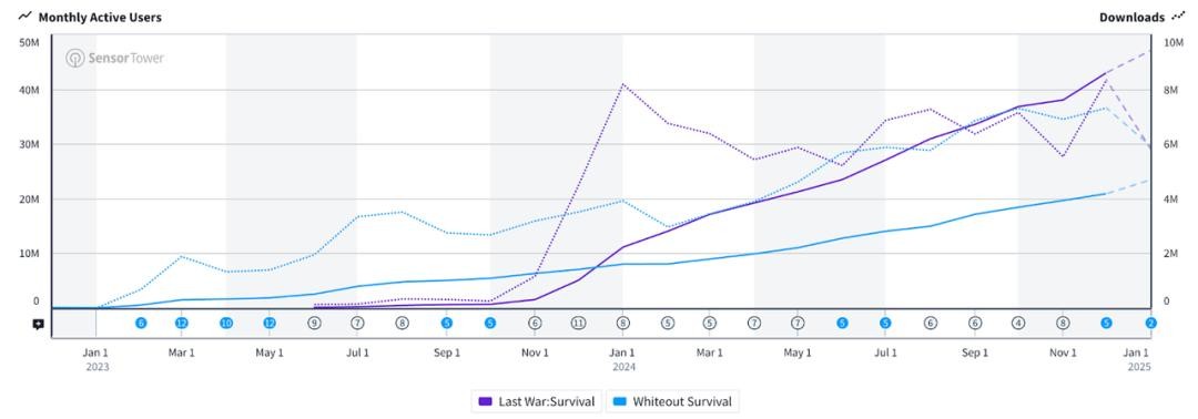 (《Last War》与《无尽冬日》的全球月活跃用户数(MAU,实线)和月度下载量(虚线)对比)