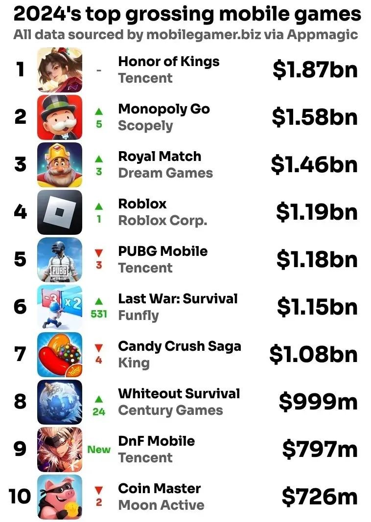 这款SLG手游于2023年6月上线,但直到2024年才真正开始爆发。根据Sensor Tower的数据,它跻身去年收入最高的五款游戏之列,年收入超过11亿美元。