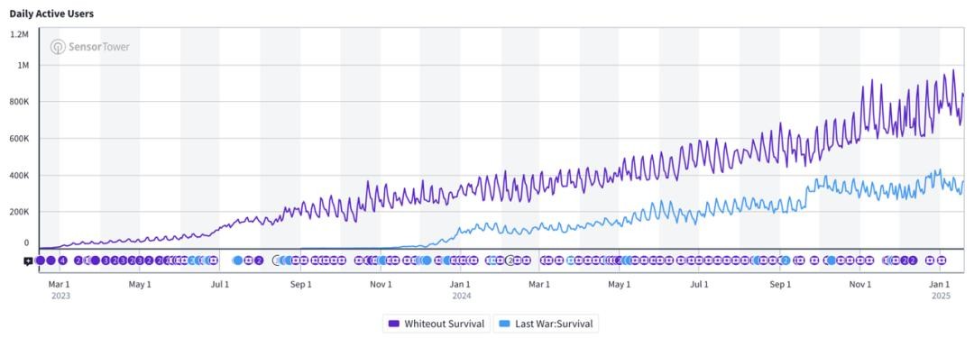 (《Last War》与《无尽冬日》的iOS美国市场日活跃用户数(DAU)对比)