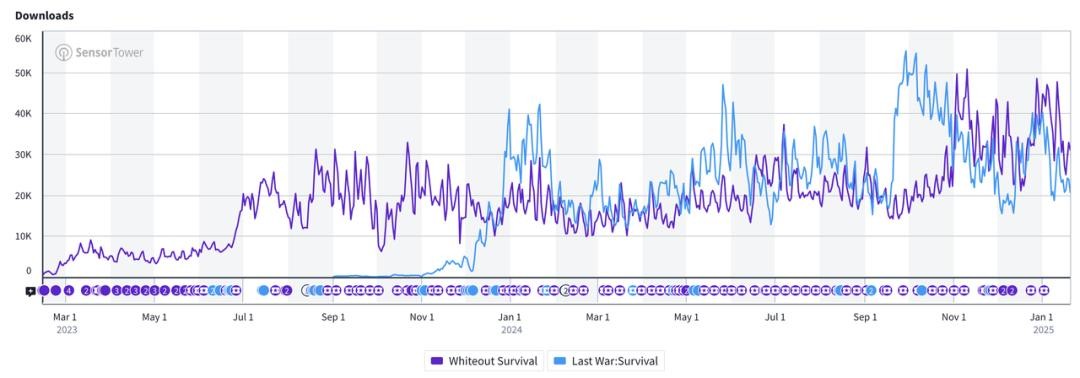 (《Last War》与《无尽冬日》的iOS美国市场下载量对比)