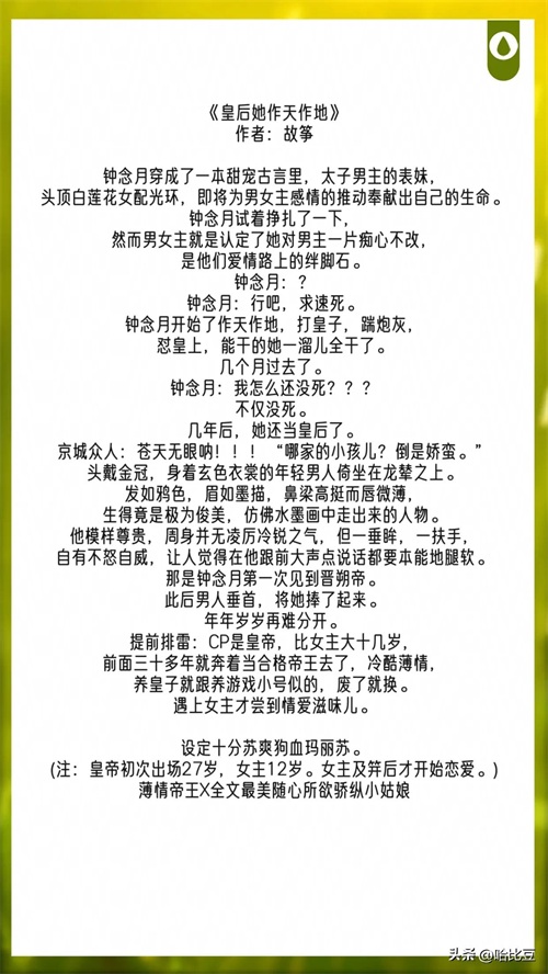 《皇后她作天作地》作者:故筝 130章 薄情帝王X全文最美随心所欲骄纵小姑娘 一句话简介:一心求死却做皇后了 立意:与既定命运抗争的精神