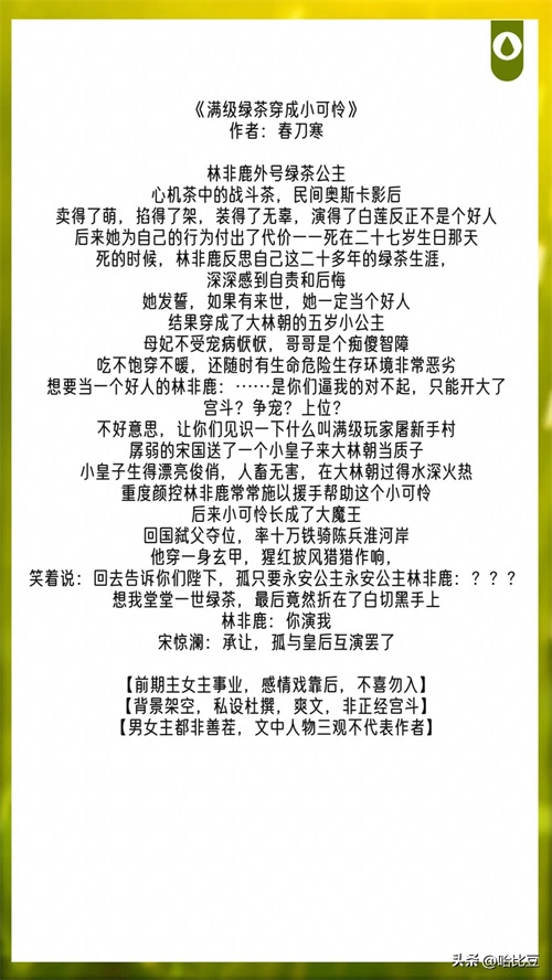 《满级绿茶穿成小可怜》作者:春刀寒 114章 一句话简介:满级玩家屠新手村 立意:共筑古代和谐家园