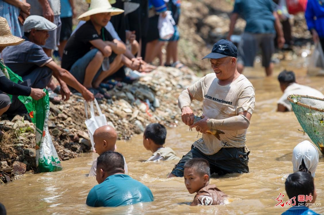2023年8月19日是农历七月初四,贵州省黔东南苗族侗族自治州从江县斗里镇马安村举行一年一度的"乌育"闹鱼节活动,人们来到河里闹鱼、抓鱼、戏水,欢度节日。闹鱼节是当地传统的民间节日,有预祝丰收之意。图为人们在闹鱼活动中戏水抓鱼。(吴德军摄/光明图片)