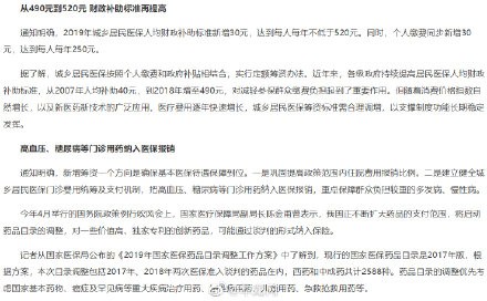 【补助提高了,范围扩大了——2019年城乡居民基本医保解读】近日,国家医疗保障局会同财政部印发了《关于做好2019年城乡居民基本医疗保障工作的通知》。从490元到520元,财政补助标准再提高;高血压、糖尿病等门诊用药纳入医保报销;大病保险报销比例由50%提高至60%;全面建立统一的城乡居民医保制度。