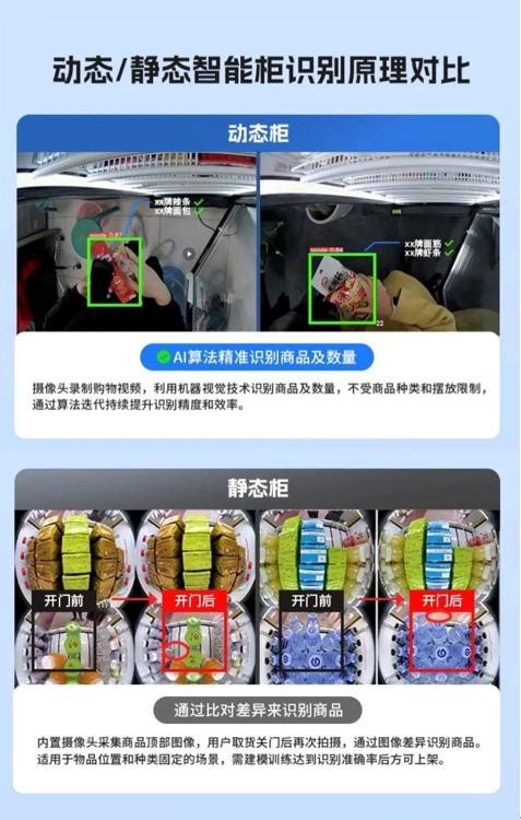 而当时兴起的AI图片识别技术给行业带来了生机,多个创业公司推出了静态图片识别方案,我们叫静态柜,即在冰箱每层顶部加摄像头,通过比对开关门前后的照片差异来识别拿走的商品,即“数瓶盖差异”。图片识别从技术上也是成熟的,对资本吸引力也是最好的,很快成为了无人零售的主流方案。除丰e足食以外,几乎剩下的无人零售创业企业都选择了静态柜。
