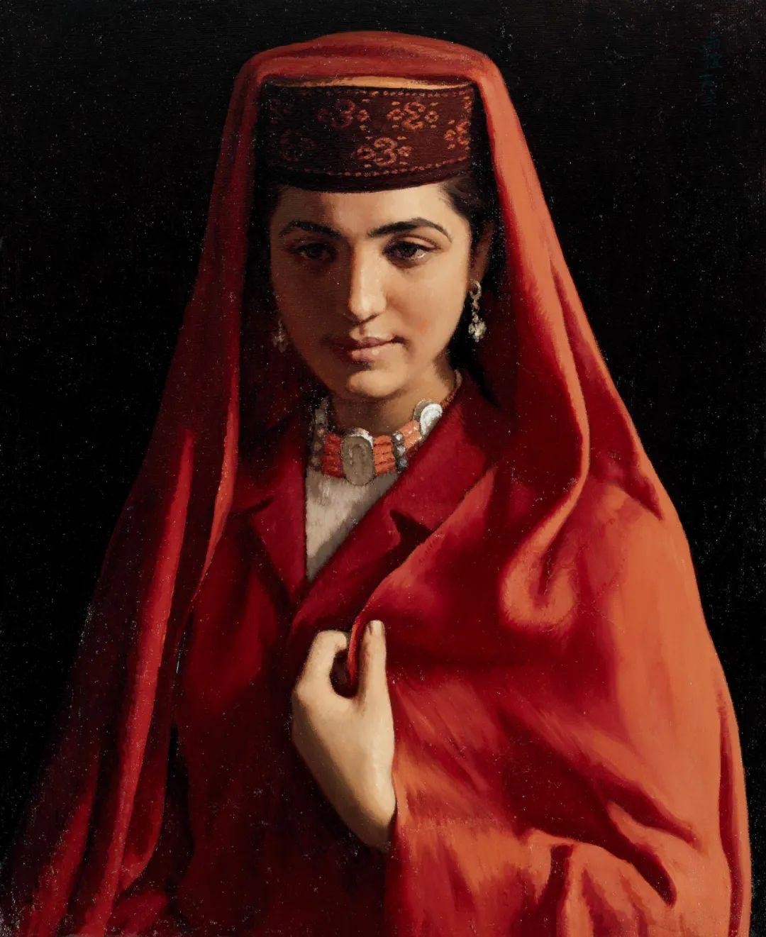 《塔吉克新娘》是著名油画家靳尚谊先生1984年的创作,此作以其成熟完美的油画表现力和独特的艺术感染力被誉为中国新古典主义油画的开篇之作,给画坛带来了清新与清纯之风。此画创作前,靳先生曾前往欧美著名的艺术博物馆进行艺术考察,专门从造型的角度研究欧洲文艺复兴以来的古典油画风格,形成了将名家大师风格手笔融汇一体的语言体悟。带着研究的成果,他在油画肖像创作上有了新的方向。根据靳尚谊先生的阐述,这幅作品是他前往新疆塔吉克民族地区采风时根据写生而创作的,设计构图时采取侧光的方式,形成强烈的明暗关系,人物形象轮廓明确,在色彩上加强色块对比,用古典造型的方法强化形体的浑厚体积感,用笔时采用小笔触点绘的技法,层次非常丰富,又有流畅的线条韵律,传达出典雅的美感。画中新娘身穿红色上衣,头戴库勒塔帽,披红色纱巾,秀美的面庞轮廓被侧光凸显得引人注目。人物的目光朝向内心世界,微微翘起的嘴唇圆润而略带拘谨,表现出新娘的端庄质朴与若隐若现的羞涩,这种专属于东方女性的含蓄之美十分耐人寻味。与此同时,画面中人物的神情和对未来生活的向往,恰好对应了20世纪80年代改革开放之初社会对回归美好和内在纯洁世界的向往,展现出一种崭新的美学理想。(本文节选自《中国美术馆人话馆藏》)