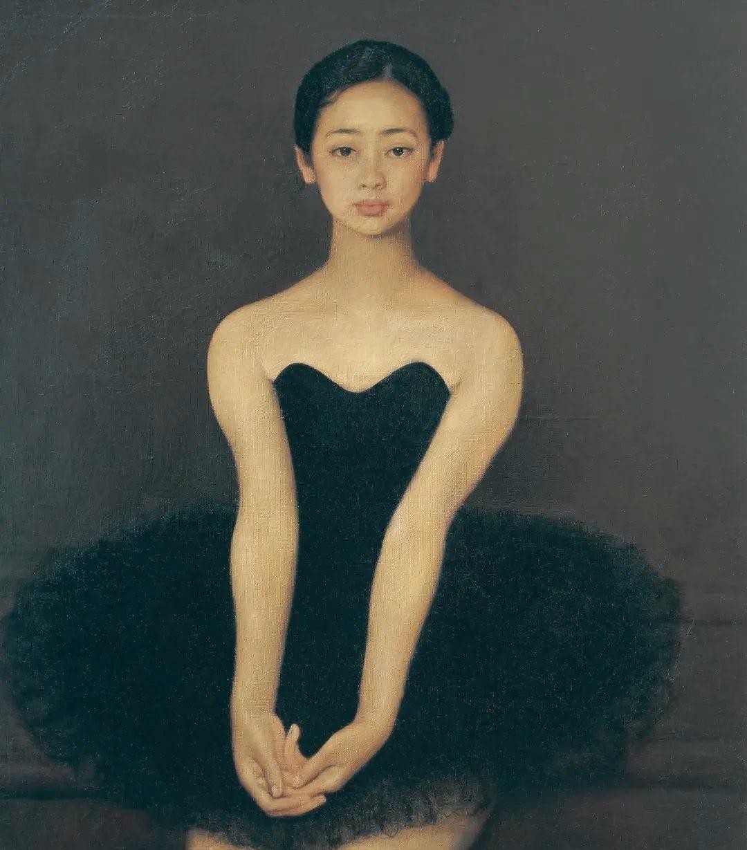 对杨飞云来说,写实油画“不是一种绘画形式,也不是一种短时间的流派,是一种表现力”。因此,从上世纪80年代初开始,杨飞云通过一系列人物肖像确立起一种客体真实性与主观理想性兼备的古典叙事方式。《小演员》就是这一阶段的扛鼎之作。与90年代以后现实指涉愈加明显的人物作品相比,《小演员》呈现为一种在对形体整体把握基础上的单纯化和理性化。构图为稳定的金字塔式,背景简化为一片色调统一的暗色,只在底部留下一根圆杠,刻意营造一种缺少纵深感的空间。通过平光的使用,在黑色的芭蕾舞裙与亮色的人体之间形成微妙的视觉反差。细腻的轮廓处理,则进一步塑造出人物的温润气质,体现出伦勃朗光线画法的影响。在杨飞云的笔下,妻子芃芃犹如安格尔笔下的里维埃小姐,散发出含蓄优雅的贵族气质。不过,整幅作品在结构、笔触和色彩上的隐忍持重,精神上更接近于丢勒、霍尔拜因等人的北欧风格。沁入骨髓的严谨精微,无疑源自杨飞云长期对文艺复兴风格技法的悉心研究。