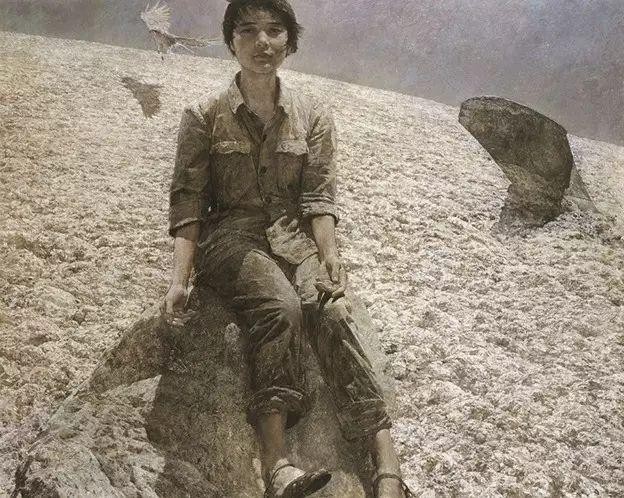 女知青坐在立于荒脊、倾斜土地的岩石上,表情和动作,环境和气氛,比前两年的画要显得冷漠和严峻。“画中的女青年是一座在阳光下裸露的废墟与风格化的土地、倾斜的地平线、翱翔的鹰一起构成一个既稳定又暗含危机的象征。这个象征符合对过去的追忆,又具有更为久远的、冷漠的含义,超越时代与社会的非人化的泛神意识”。