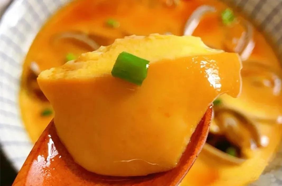 6. 蒸好的蛋羹,吃的时候淋上刚刚调好的料汁即可,鸡蛋羹吸收了蛤蜊的鲜味,吃起来超级鲜美~
