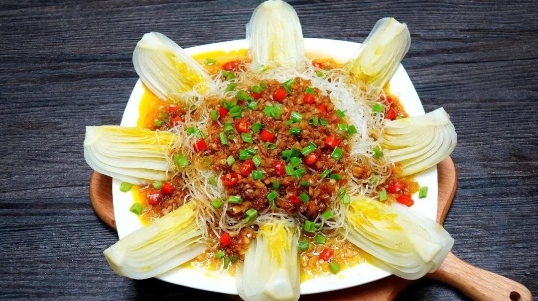 7. 然后将炒好的蒜蓉酱直接倒在摆好盘的娃娃菜和粉丝上。放在蒸锅里,盖上锅盖,蒸大约3分钟左右即可。