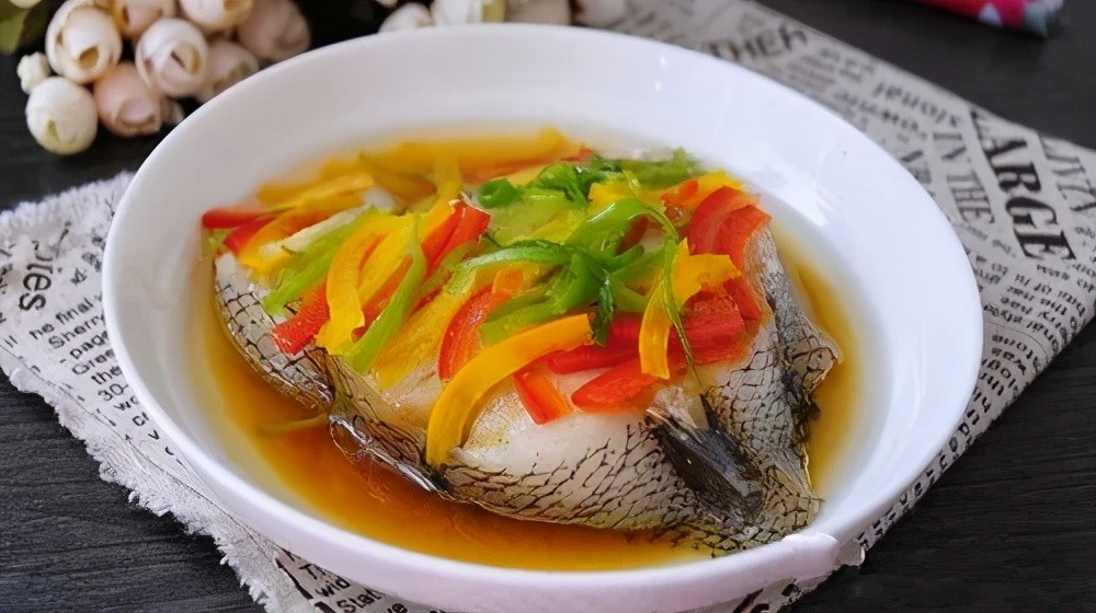 辅料:葱姜丝适量、鸡油 1勺、料酒少许、白胡椒粉适量、生抽4勺、彩椒适量