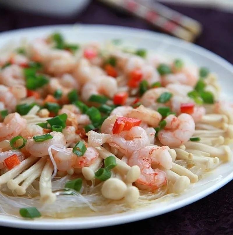 主料:虾仁150克、金针菇1小把、粉丝适量、蒜6瓣