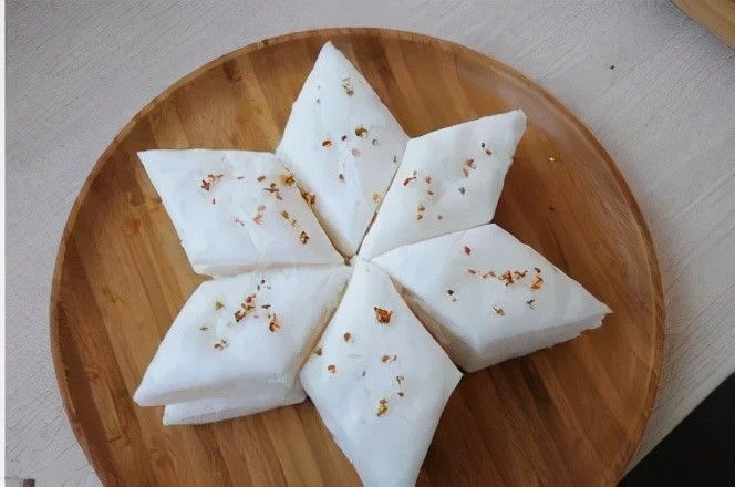 5. 蒸好后,待完全凉却,再切块装盘,淋上桂花糖浆即可。