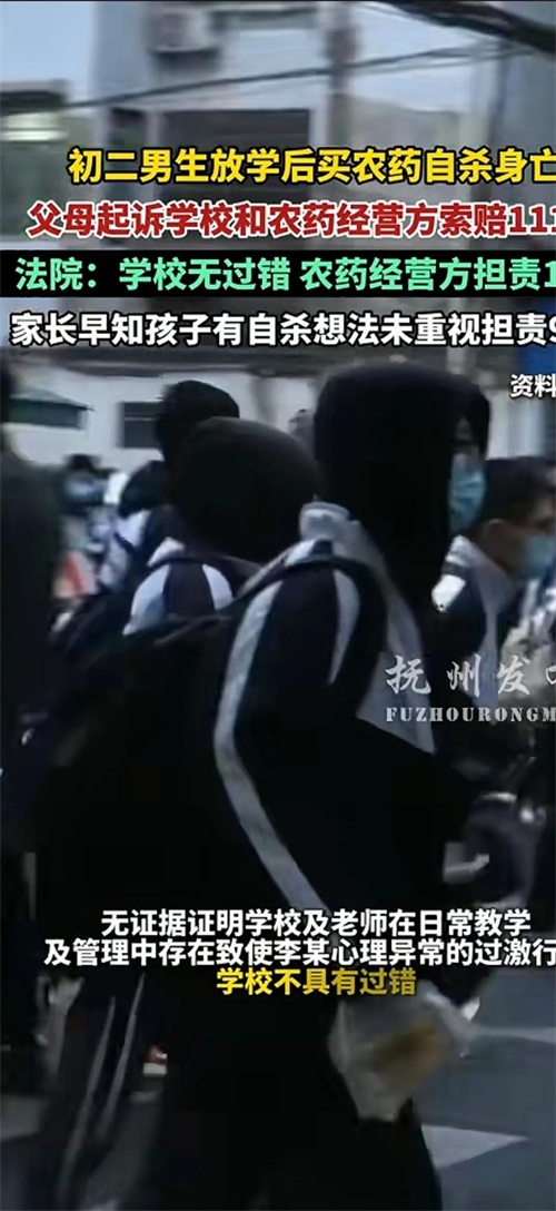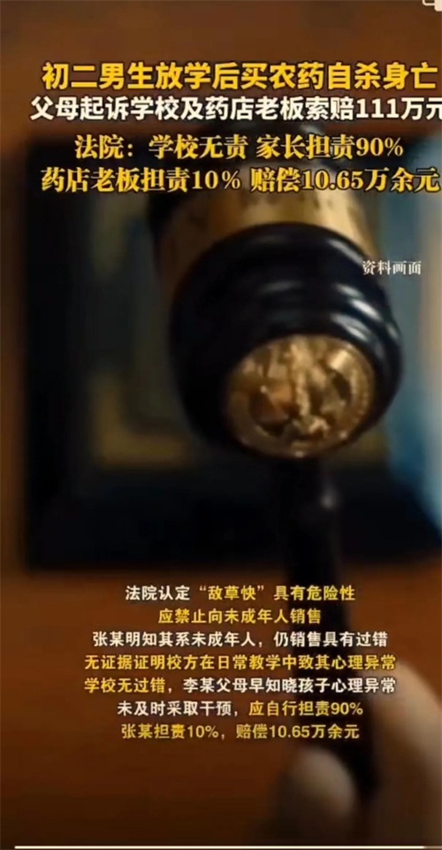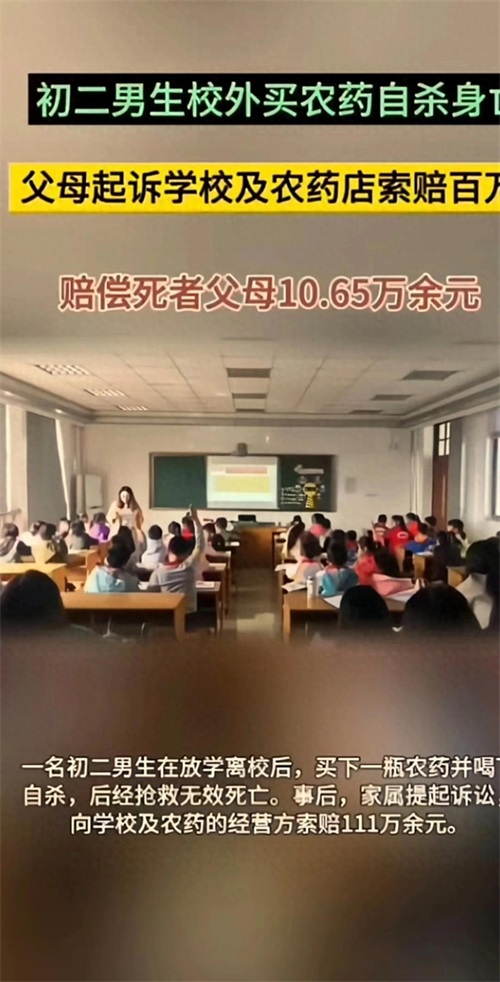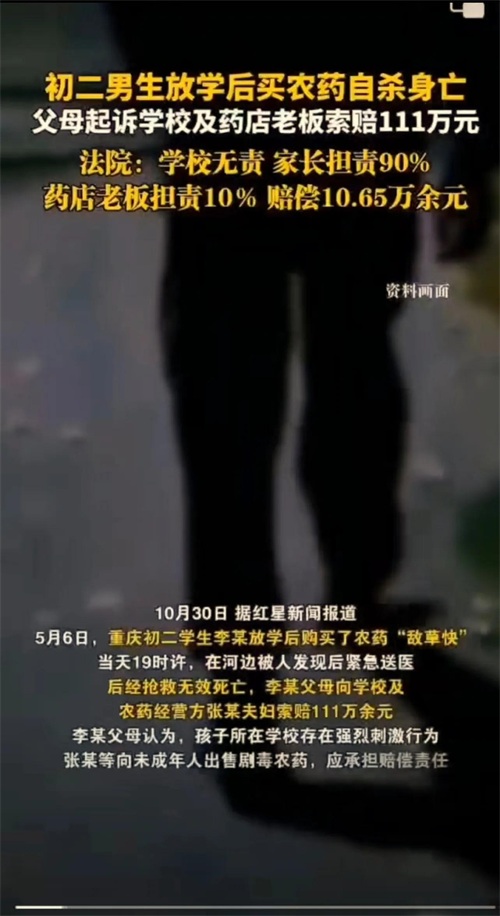初二男生放学后买农药自杀身亡,父母起诉学校和农药店索赔上百万