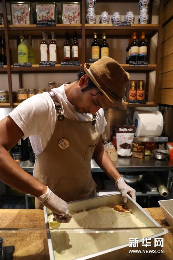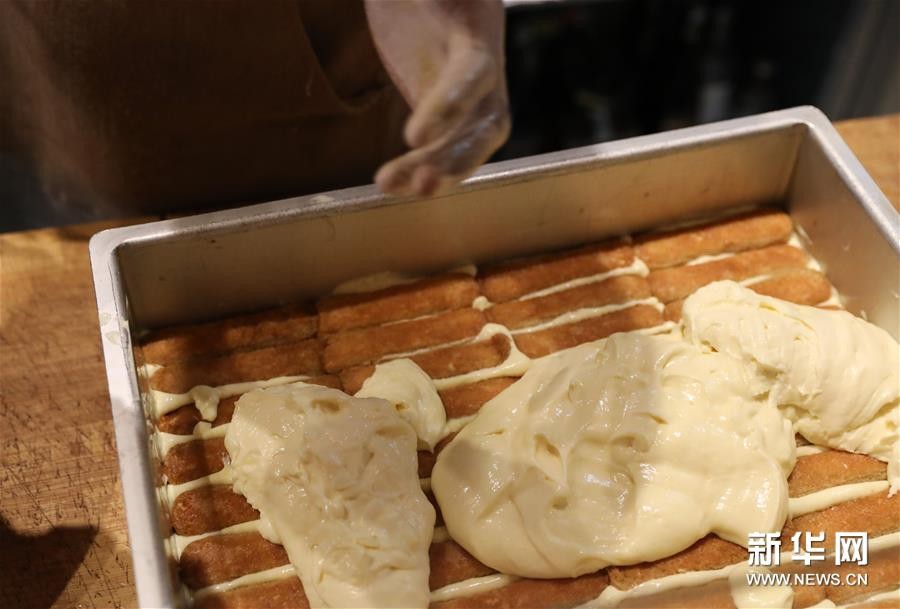 8月23日,在意大利首都罗马的一家餐厅,一名厨师将制作好的奶酪糊覆盖在浸泡过咖啡的手指饼干上。新华社记者 程婷婷 摄