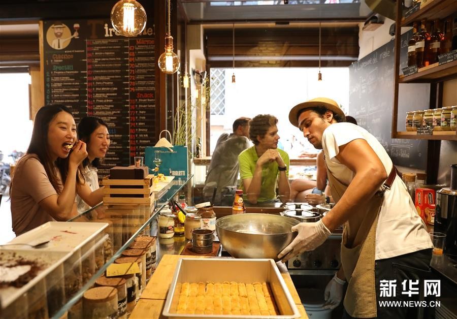 8月23日,在意大利首都罗马的一家餐厅,两名游客一边品尝提拉米苏一边欣赏厨师制作提拉米苏。新华社记者 程婷婷 摄