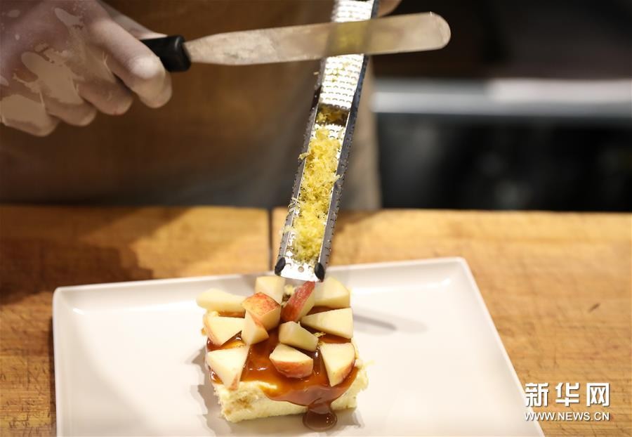 8月23日,在意大利首都罗马的一家餐厅,厨师制作水果口味的提拉米苏。新华社记者 程婷婷 摄