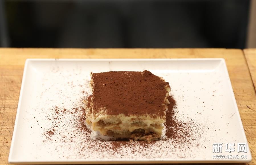 这是8月23日在意大利首都罗马的一家餐厅拍摄的一块正在制作中的提拉米苏。新华社记者 程婷婷 摄