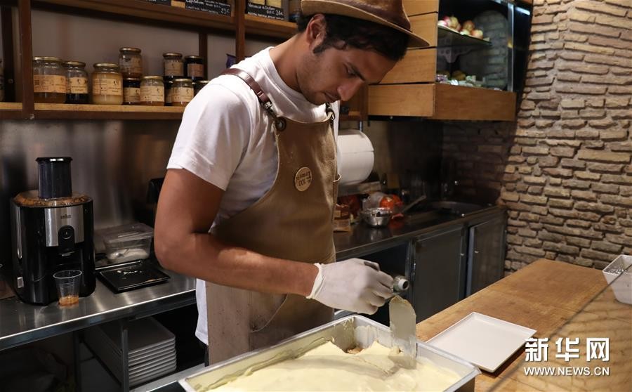 8月23日,在意大利首都罗马的一家餐厅,厨师现场制作水果口味的提拉米苏。新华社记者 程婷婷 摄