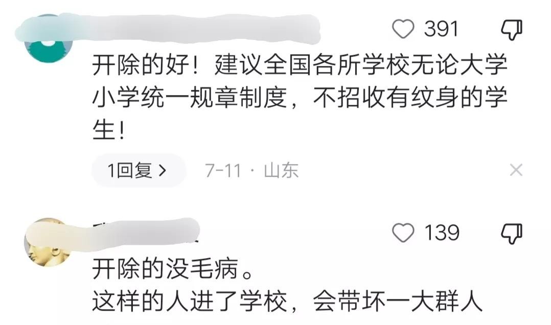 有网友留言称:“开除的好!建议全国各所学校无论大学小学统一规章制度,不招收有纹身的学生。”