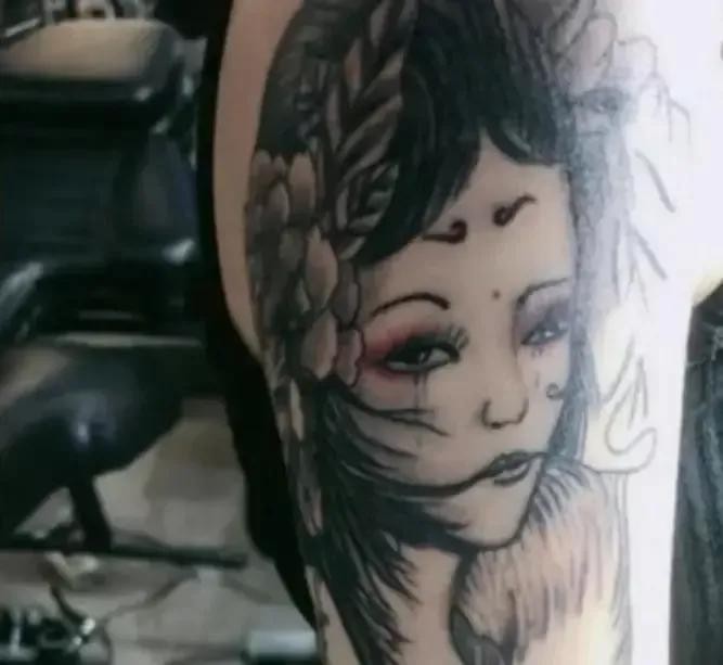 在李某丽的肩膀到胳膊肘关节的上臂位置,纹着一个很大的“日本艺伎”图案,并且这个图案还属于半裸的那种。