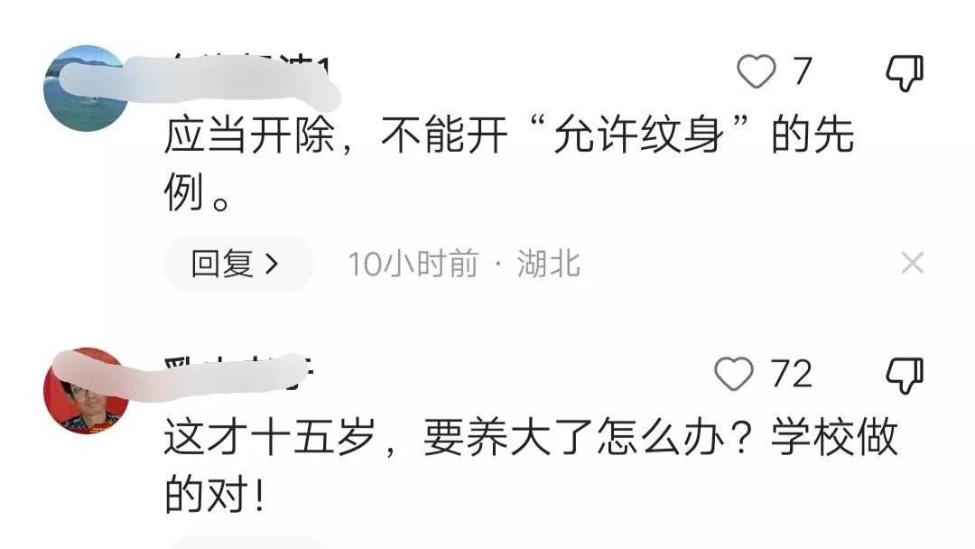 有网友留言称:“支持学校!如果这个口子松了,就代表学校黙认了可以纹身一事,会造成其它学生的校仿,到时会难以把控,学校里到处游走着纹身的学生,想想看,那是怎样的一个风景?”