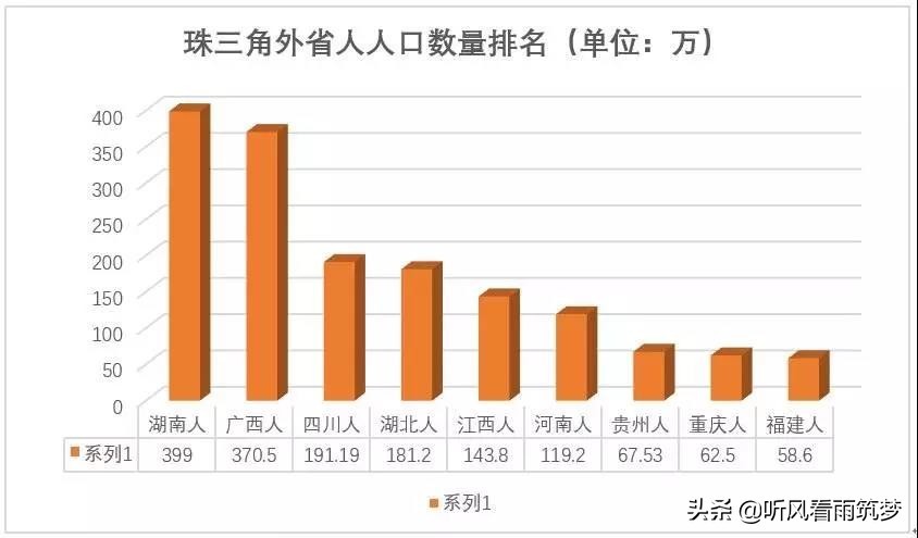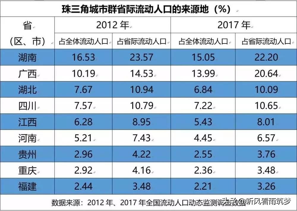 可见,珠三角外地人的第一大来源是湖南,第二大来源是广西,第三大来源是四川,前9个来源地,几乎找不到一个华东地区的省份。